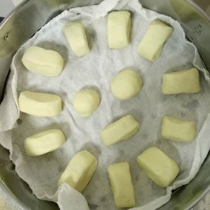 取出面团排气,搓成条切块,放入蒸锅,蒸锅放入冷水,面团在里面醒一刻钟,开火蒸半小时,关火闷十分钟即可