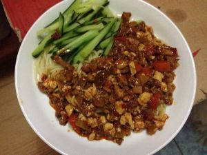 最后就是把煮好的面和酱放在一起喽,我喜欢吃生黄瓜,就切了丝放头上。