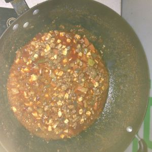 在锅里放油,热了先放入切好的小肉丁,炒熟后再多炒会,(肉最好是五花肉,没买到也要肥瘦搭配,这样才香),炒到把肥肉里的油逼出来些就好。接着倒入用水调好的酱,水酱大约4:1翻炒会倒入配菜丁,炒熟后最后放豆腐丁,炒到水收了些就可以拉。
