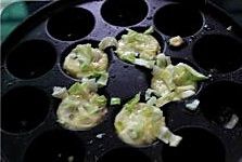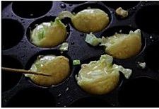 撒入章鱼碎和高丽菜碎,然后用竹签挑起翻转,再挑起翻转,如果中途觉得面糊不够,丸子可能会比较小,可以再倒入一点面糊