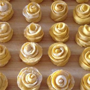把捣好的南瓜和面粉加酵母用温水和好。发酵...