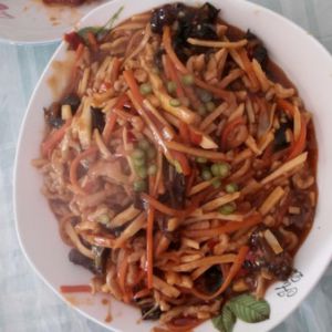 锅中放油五成热,放入蒜末,葱末,姜末,煸炒,出香味了,放入皮辣酱,煸炒,放入冬笋丝,胡萝卜丝,木耳,煸炒一分多钟,到入肉丝,接着煸炒,这时放入调好的汁儿(水半杯,醋三勺,糖一汤匙,老抽一汤匙,盐一点点,)继续煸炒,收汁收到一半的时候还有些汤,这时加入水淀粉两汤匙加点水记住水不要多,把淀粉攉开就行,到入锅中,翻炒,就可以出锅了