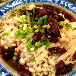 菇洗净,水烧开放进去煮三四分钟后捞起来漓干水,热锅下点油把干辣椒,花椒,八角各适量炒香装起来备用,把蒜末放在菇上把炒香的油淋上去,再用刀把把刚刚炒香的花椒八角压碎放进去,盐,再放入适量的生抽,醋,香油,最好撒上暴好的干辣椒跟香葱就搞定了