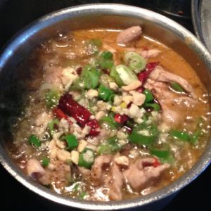 开中火,给适量的油热锅,煸炒步骤7里的作料,至可闻到香味。(要留下深绿色部分的葱花,部分干辣椒,花椒和一半的蒜末。