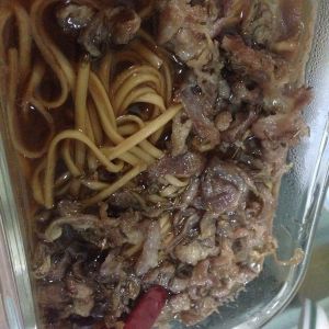 将煮好的面条盛出放进容器中,将羊肉倒在面上,从锅中盛出大半碗面汤,往面汤中放两勺蒸鱼豉油,再将面汤倒入碗中finish!