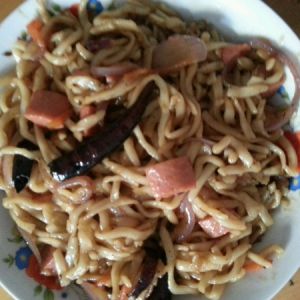 锅内放油,待油热后,放入干辣椒 火腿肠 孜然 洋葱翻炒