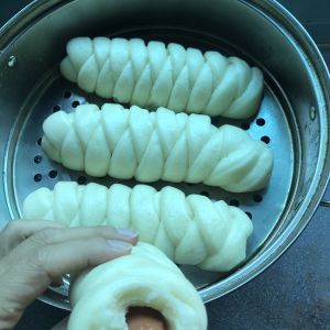 发好之后取面团100-120g/个,先排气弄成圆形,再擀成长方形,像图片这样半根火腿肠放中间,两边往外斜切几刀,中间不切断,然后左右交叉编起来,最后捏紧收口。