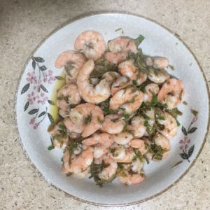 将泡开的茶叶沥干,放入油锅将茶叶炒至微干,放入腌制好的虾仁至虾仁炒熟。放虾仁的时候注意将腌制碗里的水分沥干。这道菜炒得比较干好吃一些。起锅放一些小葱调色。