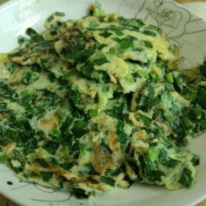 韭菜择好洗干净,切段,装盘。鸡蛋三个与韭菜,加入鸡精盐,搅拌均匀