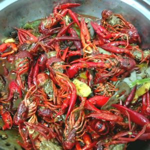 炒至小龙虾变色后加入配菜翻炒一会,然后加入适量开水煮10分钟左右,中途可以尝尝小龙虾是否入味,不入味可以增加煮的时间。