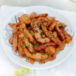 开火把油再次烧热,倒入里脊肉再大火复炸30秒后捞出备用