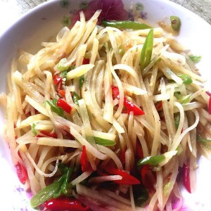 放入洗过淀粉的土豆丝翻炒几下,放入盐和少许醋,待土豆丝炒至颜色发亮有少许透明时加入一点点清水,稍微翻炒即可出锅!