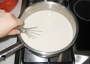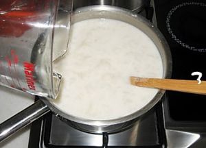 300克淀粉和1000克水调成糊状,用中火,边加热边搅动。