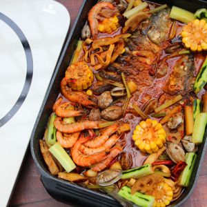 把煮到八成熟的蔬菜倒入烤鱼盘里。加入虾和贝,黄瓜,口味重的可以再加些盐。