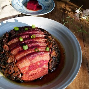 再将炒好的梅干菜放在肉片上,放在锅里,隔水蒸40-50分钟。蒸好以后找一个盘子,将扣肉倒扣在盘子里即可。