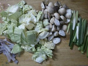 准备材料,洗净,圆白菜切片,草菇对半切,蒜苗切斜片,蒜头切未,鱿鱼切花刀