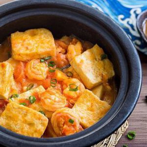 虾仁变色后,放入豆腐。加入一点番茄酱,适量盐,适量开水,炖煮入味。可以转入砂锅炖。