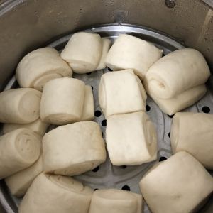 用面杆压平后卷起来,切开,放入锅里,锅里有点温水,温水就是放手下去,不烫手的就可以了,这样盖上盖子,然后等半小时,他会发酵成比原来大一点五倍,底部要放点油