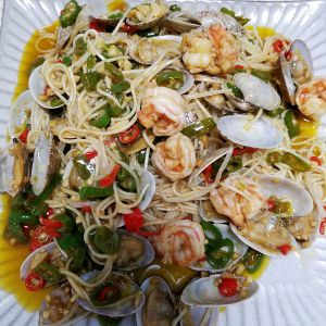 锅内倒入油,放入切碎的葱姜蒜辣椒,炒香后放入花甲,翻炒至花甲开口,再放入鲜虾,加入糖,醋、料酒,继续翻炒3_5分钟。最后放入面跟豆芽,加入盐,炒几分钟即可。