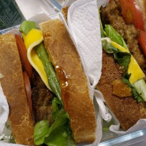 两片吐司。一片抹果酱(用自己喜欢的口味哦)放生菜片,一片依次放上西红柿片、牛肉饼、芝士片。两片分别放入烤箱上下火100度、5分钟(主要是加热芝士)。