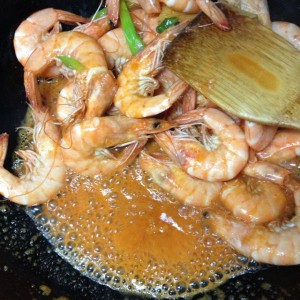 油正常放就行,葱姜呛锅,把虾放进去先炒至微红,像这样!然后倒入一小碗料酒,一定是小碗呦,翻两下迅速把锅盖儿盖上,焖20-30秒