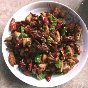 锅中烧油,待油熟后将鸡块和干辣椒放入锅中翻炒,然后放入适量的酱油上色,在放入适量的佐料(姜蒜鸡精盐花椒等)入味,最后放入切好的青尖椒翻炒增加辣味,然后就可出锅了。