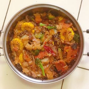 加入没有焯水的蔬菜至5分熟,再下焯过水的蔬菜,大火爆炒,最后依据口味再添加一些调味品,我比较爱吃辣,就再加了一些辣椒