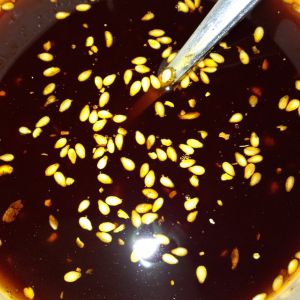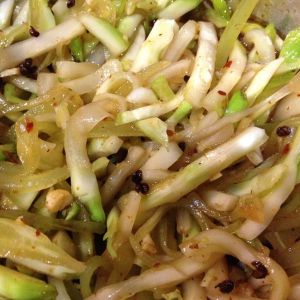 将儿菜丝、莴笋丝各分成两份,再分别混合成两份儿菜莴笋丝。其中一份儿拌入歩骤3中的调味料。再用冷油加花椒烧热后呛淋在双丝上