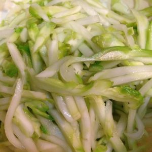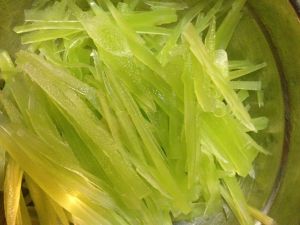 儿菜切粗丝,加盐,揉搓均匀,腌半小时后,凉白开冲去盐水。