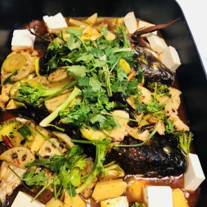 电烤锅铺上一层莲花白,放入烤好的鱼,把炒好的蔬菜倒进去,边上放豆腐,面上放香菜,再小火煮个7分钟开吃,就入味啦。菜不够吃,还可以中途随时加蔬菜进去煮着吃,等于是烤鱼火锅啦。