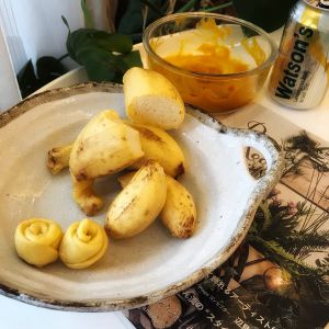 100克自发粉,加50克水和面。和面之后盖起来静置30分钟醒面。面会变大很多,一半做香蕉内陷,一半留做外皮。内陷做成几个小剂子备用。用湿布盖着。