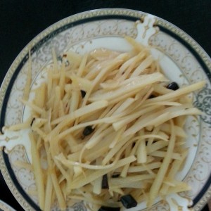 第一步,辣椒,生姜过油;第二步,放入土豆丝翻炒,之间放入料酒一勺,醋四勺(根据个人喜酸度)