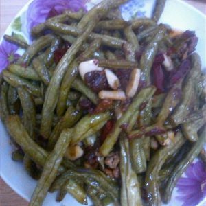 锅里放多一些油,放入控好水的四季豆,炸,边炸边翻,受热均匀。
