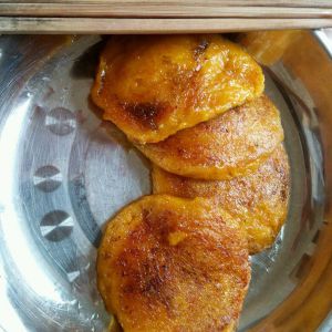 把南瓜捣烂,砂糖开水,然后加入糯米粉揉成面团