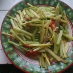 放入芹菜翻炒一会,再加人一点点水,盖好锅盖煮几分钟。