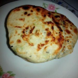 趁着发面的功夫,用锅将芝麻炒香。把葱切成葱末。