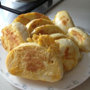平底锅或是饼铛放油预热。炸也行。但是我觉得油乎乎的。