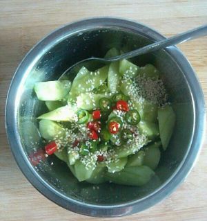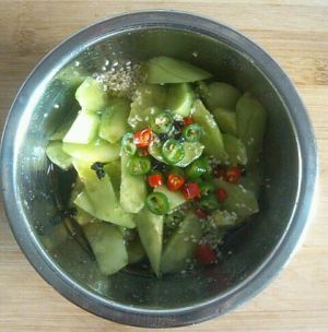 把杭椒和线椒洗净,切碎,放到瓜条上面。撒上一把熟芝麻。