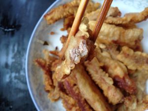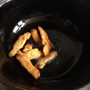 一面金黄,翻面,这时你会发现肉条体积变小了,空出的地方可以继续放入里脊肉。