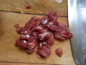 里脊改刀成条,抓少许淀粉和味极鲜,少许盐、味精入味,入冰箱静置20分钟左右。注意,改刀时要与肉的纹理垂直。