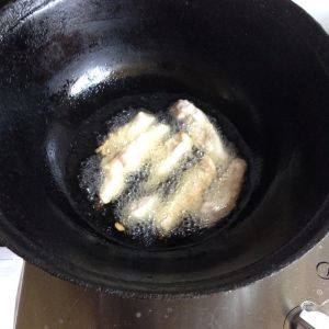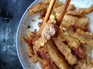 热锅,入油,滴入一滴粉糊,看粉糊周围冒小泡并很快浮起时,这时候油温正好,入挂糊的肉条,中火炸。