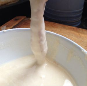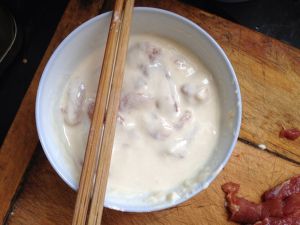 用淀粉加水调成糊,稠些,否则肉挂不上糊,这是重点。放入少许肉条,均匀挂上糊。