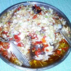 葱姜蒜切碎,铺在鱼头上,浇一些蒸鱼豉油汁,浇入热油,完成。