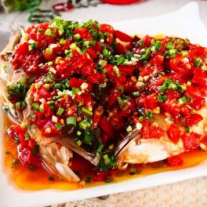 另准备一个大盘,小心地将蒸好的鱼头平铺在大盘上,什么葱结,姜片通通不要!再将新解的剁椒均匀地铺在鱼头上,如果能吃辣,可以再加些野山椒末。