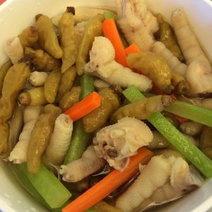 水开加入食盐料酒少许,鸡爪下锅煮十分钟左右。捞出用清水洗净并改刀备用。将之前切好的胡萝卜和莴笋抄水。和改刀后的鸡爪一起放入密封容器内。