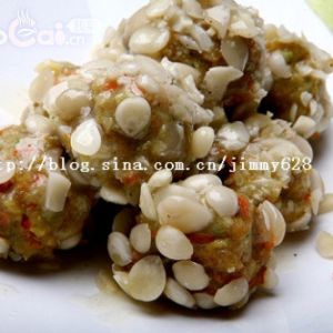 肉馅用手捏成小丸子,蘸上胡萝卜丝、苦瓜丝、杏仁碎,装在盘中,盖上保鲜膜用中火五分钟。