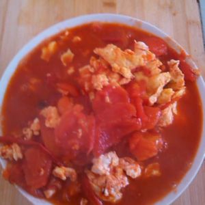 把西红柿倒入,搅拌到这种程度。倒入炒好的鸡蛋。加盐(因为鸡蛋中之前已经加过盐了,所以这次加盐一定要注意用量)。
