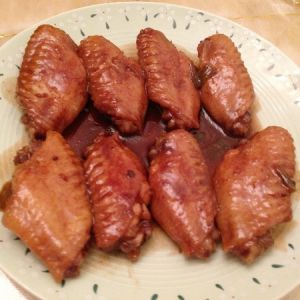 酱汁快要收干也就是大概二十多分钟后关火,鸡翅一个个夹出来摆盘葱姜挑掉最后把酱汁浇上去