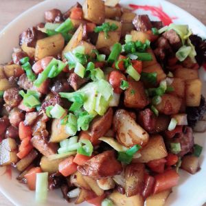 肉色看起来像是红烧样子,然后放胡萝卜丁,土豆丁继续烧几分钟,中间要翻炒,锅里有点干了的话适量的放点水,