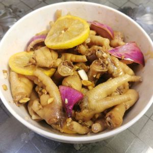 锅中放入鸡爪生姜片,料酒,可以放少许盐,也可以放少许卤料,煮最多十分钟。捞出切掉鸡脚指甲,切两节。
